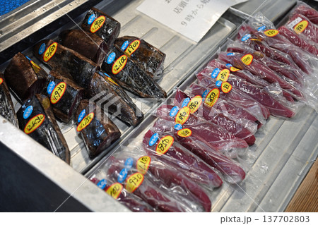 高知名物の鰹のタタキと刺身の店頭販売 久礼の市場に並ぶ新鮮な地物カツオ