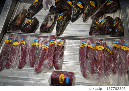 市場で販売される新鮮な干物のパック詰め 鯛や鯖の干物セット