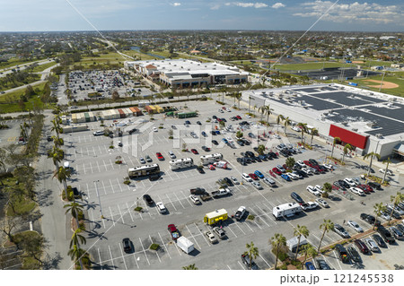 Aerial view grocery shopping mall and many colorful cars parked on parking lot with lines and markings for parking places and directions. Place for vehicles in front of a strip mall plaza