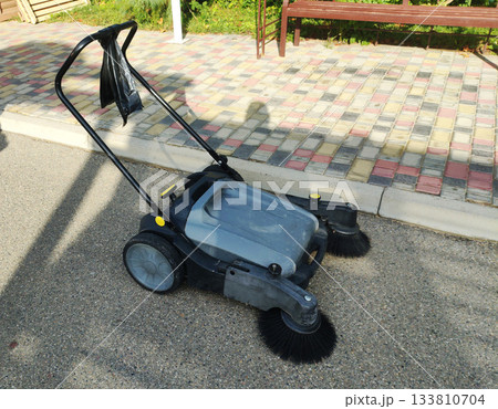 Manual push sweeper machine for outdoor floor cleaning, gray body and black handle, positioned on asphalt path near decorative paving stones and green garden area with wooden bench under daylight
