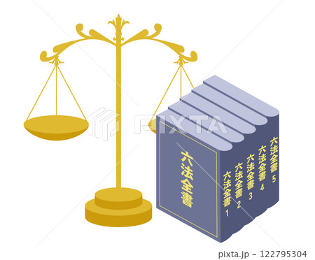 アンティークなてんびんと、日本の法律書の六法全書のイメージのイラスト