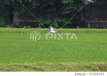 埼玉県毛呂山町の長閑な緑の水田を飛び立つ飾り羽を付けたアオサギ