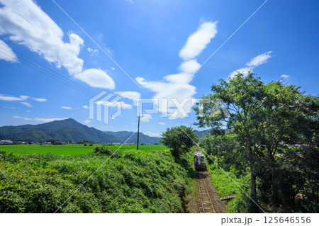 広くて青い空の下で直線を疾走する若桜鉄道の気動車