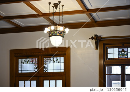 大正時代の洋館のステンドグラスの窓の前のレトロな大理石の電話