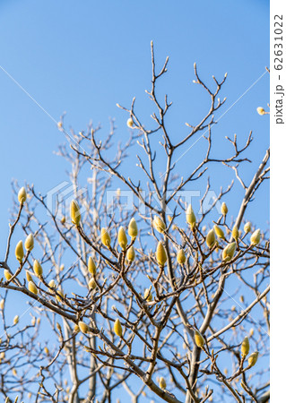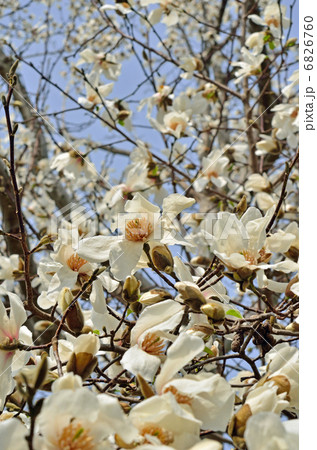 春の素材・青空に純白の辛夷の花たくさん・縦位置青空バック