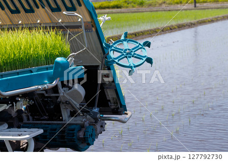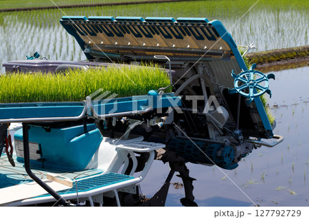 稲の苗を乗せた田植え機とマーカー。田んぼの水面の背景