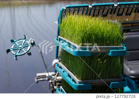 田植え機の苗と水田。稲作の準備と農機具