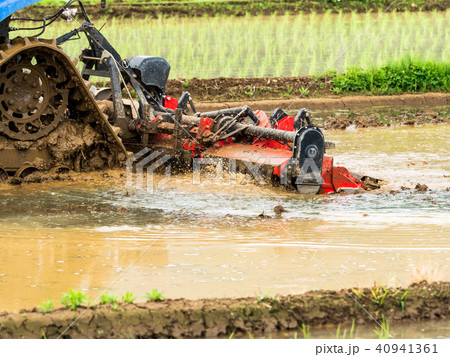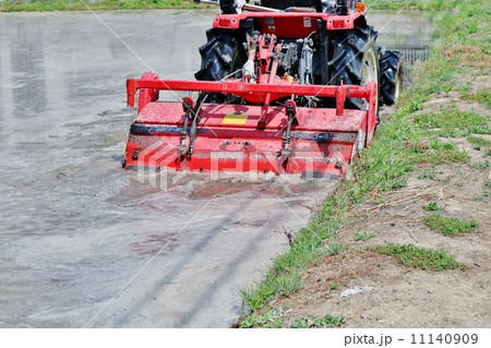 トラクターで代かきをする風景 水田とトラクター 田植えの準備作業 農作業イメージ イメージ素材