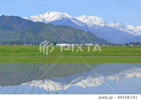 田植え時の山麓から望む北アルプス後立山連峰