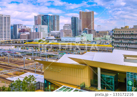 日本の東京都市景観長弩級幸運を呼ぶ新幹線・ドクターイエローや芝浦などを望む。右は高輪ゲートウェイ駅