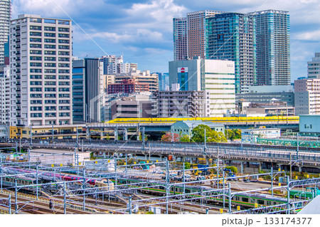日本の東京都市景観 新幹線や2本の京浜東北線、芝浦アイランドケープタワーなどタワーマンション群…
