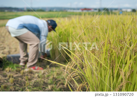 稲刈りをする男性