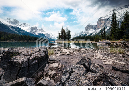 View of Spirit Island with Canadian Rockies in Maligne Lake at Jasper national park, Canada