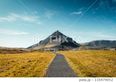 Stapafell volcanic mountain in Arnarstapi fishing village and pathway through golden meadow at Iceland