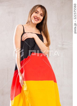 Portrait of confident, uninhibited young woman wrapping herself in flag of Germany while posing against gray wall