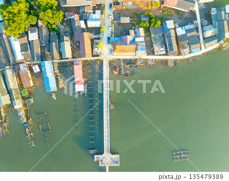 Aerial view top view of the fisherman village with fishing boats and house roof at the pier in Phangnga Thailand, Panorama high angle view
