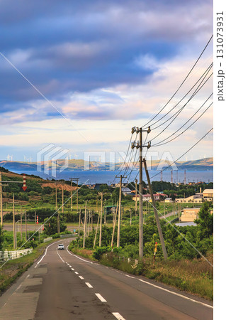 海へ続く道と風車群の眺め