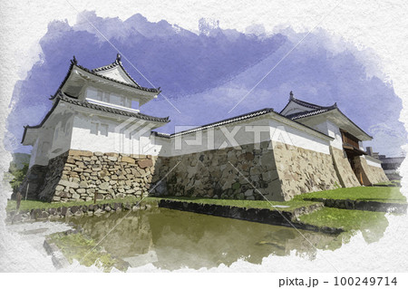 水彩画風 舞鶴公園 田辺城跡 城門と隅櫓 京都府舞鶴市