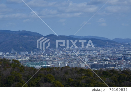 甲山の南側の山麓に位置する甲山大師神呪寺の展望台から青空の下、大阪平野を望む
