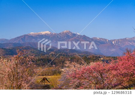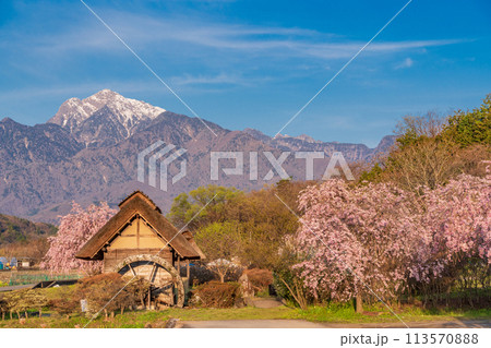 【山梨県】北杜市武川町、水車の里公園の枝垂桜と残雪の南アルプス
