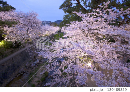 夙川公園(夙川河川敷緑地)、川の水面に映る桜並木の夜桜「日本さくら名所100選」(苦楽園口付近)