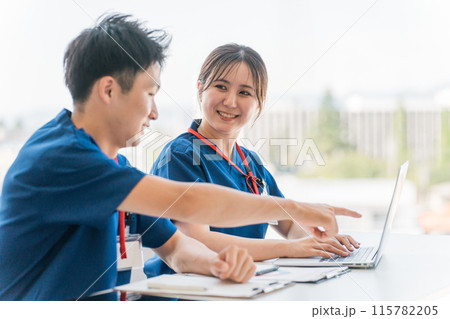 スクラブ姿の医療従事者,医療スタッフ,医師の男性と白衣姿の看護師の女性