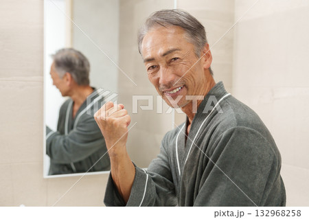 洗面所にいる笑顔のシニア男性