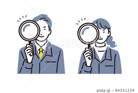 人物 虫眼鏡をのぞく作業服を着た男女セット