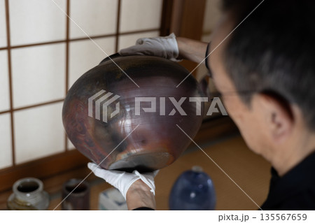 銅壺を手に取って確認する和服の男性 鑑定士 古物商 収集家 イメージ