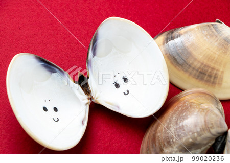 ひな祭りイメージ。夫婦円満の象徴とされるハマグリの貝殻の内部に描かれた、雛人形風の顔。