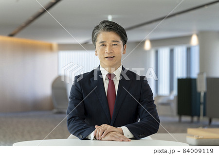 カメラ目線で笑顔の50代のビジネスマン 撮影協力「LINK FOREST」
