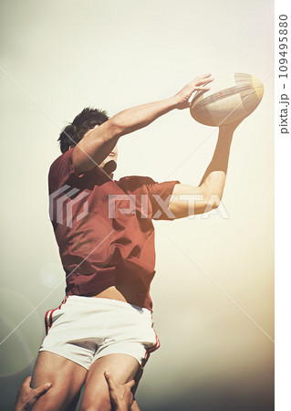 Rugby, sports and jump and man on field for athlete, health and stadium practice. Challenge, competition and performance with male person in outdoor pitch for exercise, games and workout