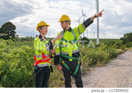 Team of professional electrical engineers in fully safety suit are working and discussing together at the windmill electric generating turbine. Electricians working at the site of windmill turbine.
