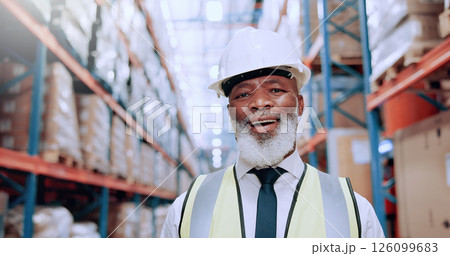 Warehouse, smile and portrait of black man in shipping inventory for boxes, shelf or stock management. Distribution, plant or mature worker in cargo storage for global export in supply chain business