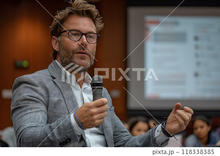 Man with microphone on tribune. Candidate on podium, politician speaker on podium. President or leaders audience. Government oratory spokesman gesture on senate or lecture