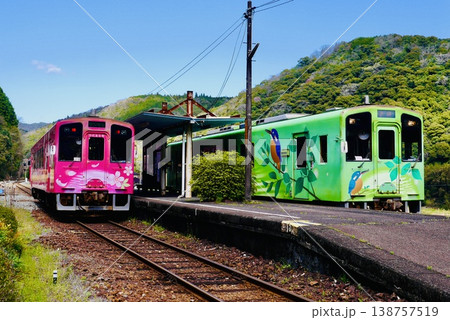 単線の錦川清流線で上りと下りがすれ違う駅