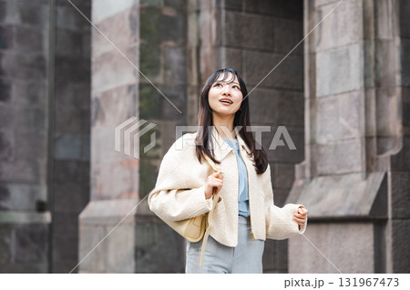 休日に都会を街歩きする若い女性
