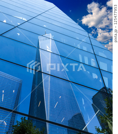 Tall Reflective Office Towers with Glass Facades Captured from Street Level Looking Up
