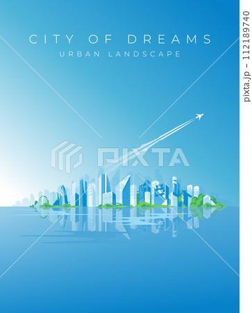 Skyscrapers of the metropolis panorama on the background of the endless blue sky without clouds. Water reflection. Airplane trail in the sky. Banner, wallpaper. Vector illustration