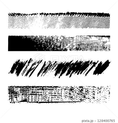 Halftone grunge brush stroke collection. Rough textured grainy dirty stripe set. Gritty distressed elements for text box, banner, poster, label, badge, collage, frame, border. Vector paint stain pack