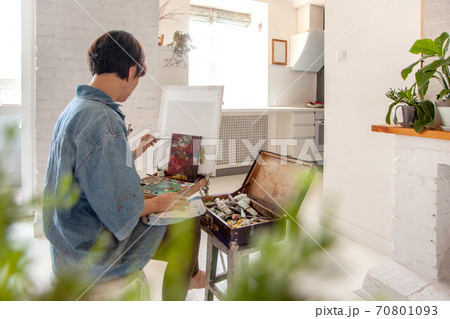 Concentrated short-haired female artist painting on cotton canvas with oil paint at home