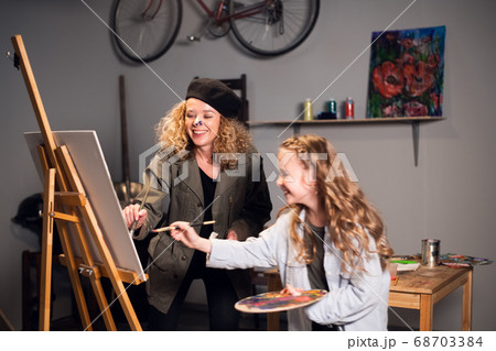 Joint work of two artists. Young funny girls draw a picture in the artist's Studio.