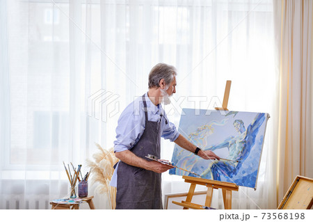 Image of pleased man artist painting picture with watercolor on canvas in art workshop. Art, creative hobby and leisure activity concept