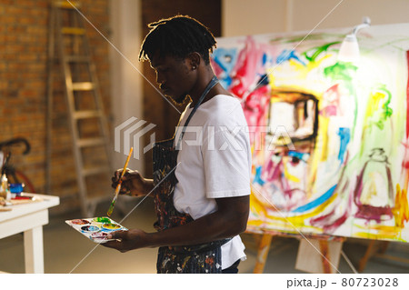 Creative pensive painter paints a colorful picture. Closeup of painting process in art workshop