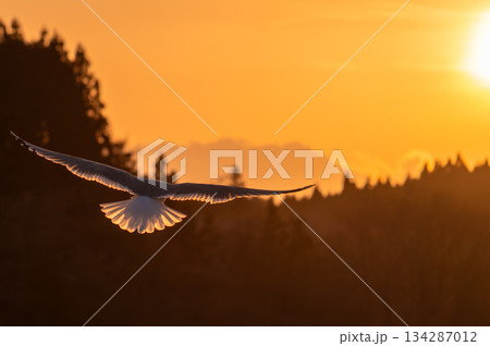 自由と成功のイメージ(夕焼け空を舞う海鳥(カモメ)と輝くリムライト)夕景の空に広がる文字入れスペース