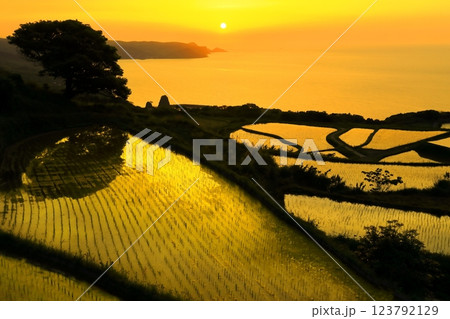 棚田と棚田から眺めた日本海の景色