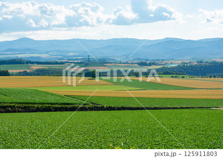 緑の野菜畑と黄金色のムギ畑 十勝岳
