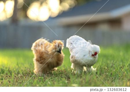 Domestic chicken on small backyard. Silkie chicks sustainably raised in free range conditions