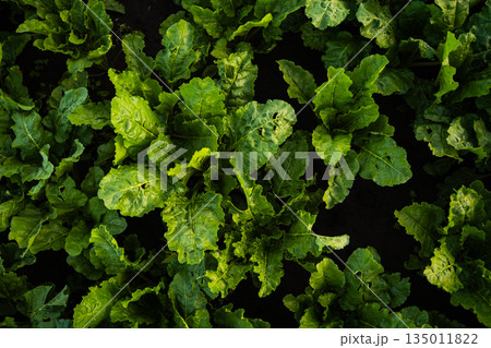 Top view of green beet plants growing on fertile soil in agriculture field, healthy leafy crop pattern, farming background, sustainable agriculture production