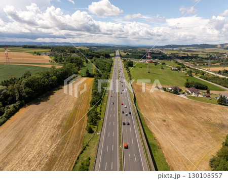 Aerial view of cars driving on highway crossing the Austrian countryside near Neumarkt an der Ybbs in lower Austria, with fields and forests
